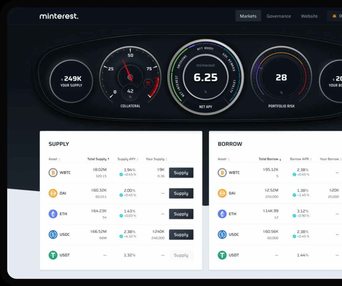 These fees are then automatically converted into its native MNT governance token through a buyback process. This token is then distributed to Minterest users as a reward for their participation in the protocol’s governance, resulting in the highest long-term yields in DeFi. Minterest’s liquidation engine sets it apart from other protocols, enabling it to capture significantly more fees. Additionally, Minterest employs a risk prediction engine that assists borrowers in safeguarding their assets through live alerts, making it a highly innovative platform in the DeFi space.